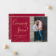 Gold Burgundy Foto Pregnancy Announcement Cards. Erwartende Eltern! Moderne handgeschriebene Typografie"kommt bald" Skriptkarte, um Ihre glücklichen Nachrichten mit Familie und Freunden zu teilen. Die Features oben und der untere goldene Konfetti-Rahmen auf bordeauxroten Hintergrund. Sie können das Design personalisieren, indem Sie die einfachen Texte und das vertikale Foto ersetzen. #3351 Wenn Sie Hilfe oder passende Artikel benötigen, kontaktieren Sie mich bitte!