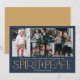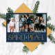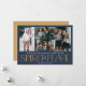 Diese Foto-Grußkarten sind mit dem Gruß "Frohe Weihnachten und ein glückliches neues Jahr" und dem Gruß "Spirit of Peace" in großen goldenen und Elfenbeinbriefen auf mariniertem Hintergrund mit Platzhaltern versehen, um vier Ihrer liebsten Fotos, Familiennamen und das Jahr hinzuzufügen.