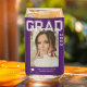 Foto Graduation Party Elegant Modernes Script Can Glass Bierglas mit Ihrem Lieblings-Foto mit dem einfachen weißen Text "Grad (Jahr)" und Ihrem Namen und personalisierten Abschluss Details auf einem lila Hintergrund. Ideal für eine Abschlussfeier. Erstellt von ©Evco Studio www.zazzle.com/store/evcostudio