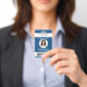 Repräsentieren Sie Ihr Unternehmen stilvoll, indem Sie den Mitarbeitern moderne und berufliche Identifizierungssysteme anbieten. Das Logo, das Foto, der Bar und alle Formulierungen auf dieser Vorlage sind einfach zu verändern. Das blau-weiße Design beinhaltet Ihr Firmenlogo, ein rundes Bild, Mitarbeitername und -titel sowie Ihren UPC/Strichcode. Es bietet die Organisation und Sicherheit für die Mitarbeiter des Unternehmens und präsentiert das Corporate Branding mit einem stilvollen klassischen Aussehen.