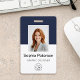Erleben Sie mit diesem raffinierten marineblauen Abzeichen-Design einen beruflichen und nachhaltigen Eindruck. Die gepflegte, zweifarbige Ästhetik wird durch eine schlichte horizontale Linie geteilt, die ein raffiniertes und ausgewogenes Aussehen schafft, das das Foto und die wichtigsten Details des Mitarbeiters unterstreicht. Der minimalistische Stil sorgt dafür, dass die Markendarstellung Ihres Unternehmens mit Klarheit und Eleganz präsentiert wird.