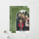 Eine moderne frohe Weihnachtskarte in Oliven- und Grüntöne-Tönen. Der Bereich des Fotos ist ein Mod-Bogen mit weißem Rand. Das moderne Design umfasst Streifen und klassische Schrift für den Hauptteil des Textes. Der Hintergrund ist ein modernes abstraktes Design mit Punkten und Kreisen mit einem Platz für 2 weitere Fotos.