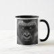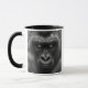 Ein schwarzes Bild eines Gorillas zeigt einen intensiven und bedrohlichen Ausdruck. Der Blick des Tieres mit hellen und glänzenden Augen scheint das Ziel zu durchdringen und dem Bild eine fast übernatürliche Dimension hinzuzufügen. Die Textur der Gorilla und die Details ihrer markierten Merkmale kommen durch subtile Beleuchtung und Schatten hervorragend hervor. Einige Lichtsplitter im unscharfen Hintergrund verleihen der Szene einen dramatischen Effekt, der den Eindruck der Rohkraft und Majestät dieses beeindruckenden Tieres verstärkt. Dieses Porträt ist eine Würdigung der Stärke und Eleganz der Wildtiere.