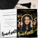 Feiern Sie die Uni- oder Highschool-Abschluss Ihrer Tochter mit dieser atemberaubenden Modern Gold Foil Script Kalligraphie Graduate Foto arch Party Einladung. Die von der Künstlerin Catherine Sweetman entworfene Karte besticht durch eine elegante Goldfolienkalligraphie und einen skurrilen Bogen der Aquarellfarben, der den Geist des Ortes einfängt. Die Vorderseite zeigt den Namen und die Abschluss Ihrer Tochter in einem stilvollen goldenen Foil-Skript auf schwarzem Hintergrund, während die Rückseite Platz für zusätzliche Informationen in moderner Stiltypografie bietet. Mit einer einfach zu bedienenden Fotovorlage können Sie die Karte mit einem hochgeschätzten Foto Ihres Absolventen personalisieren. Dieses einzigartige, originelle Design ist der perfekte Weg, um an ihre Errungenschaften zu erinnern und die Freude mit Freunden und Familie zu teilen.