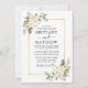 Wasserfarbe Elfenbeinweiße Blumengrün Hochzeitseinladung Karte beinhaltet Elfenbein cremefarbene Rosen und botanische Vegetation. Goldrahmen. Foto zurück.