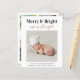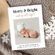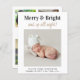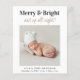 Spaß preisgünstig 4 Foto Weihnachtsgeburtshilfsankündigung. Die Vorderseite zeigt das Bild Ihres Neugeborenen mit "Merry & Bright and up all night!", geschrieben in einer Mischung aus eleganter Typografie und einem stilvollen Goldskript. Fügen Sie Ihrem Baby den Namen und die Geburtsdaten hinzu. Hinten drei zusätzliche Fotos, ein Feriengruß und Ihre Namen.