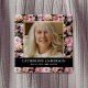 Feiern der viereckigen Beerdigungsknopf mit einem stilvollen schwarzen Hintergrund, eleganten pinkfarbenen Aquarellfarben-Blume, einem Foto Ihres Liebsten in einem Imitat-Goldrahmen, ihrem Namen und Geburts-/Sterbedatum.