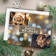 Modernes Foto Collage Postcard. Fügen Sie der Postkarte zwei Ihrer Lieblings-Fotos hinzu. Der Text "Happy Ferien" ist in einem modernen, weißen Schriftart auf grauem Hintergrund gehalten. Das hintere Foto ist mit festlichen Lichtern ausgestattet - Sie können es mit Ihrem Foto ändern. Ideal für Weihnachten und Neujahr Grüße.
