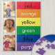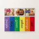 Spielerlernen - personalisiertes Foto-Puzzle mit Regenbogenfarben. Die Fotovorlage ist ein Set für Sie, drei Ihrer Lieblingsfotos hinzuzufügen, die im Porträtformat auf einem schwarz-weißen Hintergrund dargestellt werden. Die Farbblöcke sind jeweils mit dem Namen der Farbe in einfacher Typografie versehen, um die Wortzugehörigkeit zu fördern und dabei zu lernen, die Farben zu erkennen. Die individuellen Fotos machen das Spiel zu einem besonders unterhaltsamen und lehrreichen Spiel, das Ihr kleiner Junge oder Ihr Mädchen immer wieder genießen kann.