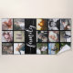 Auf diesem einzigartig bedruckten Strandtuch, das auf einem runden schwarzen Hintergrund mit quadratischen Fotos und einem Gitter versehen ist, werden 15 beliebte Fotos oder Erinnerungen gezeigt. Perfekt für Ihre Instagram Schnaps, Handtuch mit 15 Fotovorlagen mit "Familie" in der Mitte in modernen Schrift-Schriften.