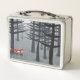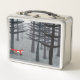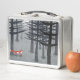 Ein einziger wilder roter Fuchs steht unter den Kiefern in einem dunklen Wald. Für Natur, Wildtiere und Tierfreunde.