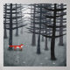 Ein wilder roter Fuchs steht unter Bäumen in einem dunklen Wald. Ein Landschaftsbild für Tiere, Natur und Wildtiere. Originelle Kunst von Nic Squirrell.