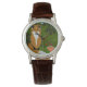 Diese wunderschöne, braune Lederrippenuhr mit wunderschön illustriertem Red Fox (mit Kardinal und Wassermelone) ist ein einzigartiges Stück für Fox-Liebhaber auf der ganzen Welt!