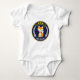 Ein Bodysuit, der eine Abbildung eines Fuchses in einem Kranz mit Eichel, Blätter und Blume zeigt. Personalisieren Sie den Namen. Der Hintergrund ist marineblau Zickzack mit Goldpunkten.