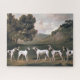 Dieses Design zeigt ein Gemälde des englischen Künstlers George Stubbs (1724-1806). Es zeigt fünf Foxhound Hunde, die in einer Linie auf einem schmutzigen Weg vor einer wunderschönen Naturlandschaft mit grünen Feldern und sanften Hügeln stehend sind. Die Hunde haben weiße Pelzmäntel mit schwarzen Flecken. Das Originalwerk wurde 1762 von George Stubbs gemalt.