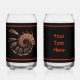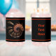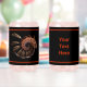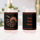 Une image fractale multicolore (rouge, jaune et orange) en spirale, ressemblant à un oiseau ou à un dragon plumé, sur un arrière - plan sombre. Customisez en ajoutant votre propre texte à l'envers. Vous pouvez modifier à la fois la couleur du texte et la police.