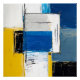 A burst of vibrant colors like yellow, blue, and white, interwoven with black strokes, forms an abstract composition reflecting chaos and balance. Paint layers suggest emotional depth and movement, inviting personal interpretation.