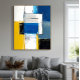 A burst of vibrant colors like yellow, blue, and white, interwoven with black strokes, forms an abstract composition reflecting chaos and balance. Paint layers suggest emotional depth and movement, inviting personal interpretation.