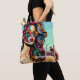 Personalisierte Einkaufstüte. Einzigartige Ai-Kunst, die eine schöne moderne Frau mit farbenfrohen Haaren und Sonnenbrillen in einem Bikini am Strand darstellt, in dem sie reflektiert wird. Pop Art Comic Stil gebrochen Kunst.