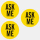 Frag mir | Gelbes Volunteer Abzeichen mit dem Titel "Frag Me" in schwarz fett Sans Serif Schriftart auf gelbem Hintergrund.