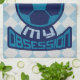 Fußball-Design in blau mit einem Fußball / Fußball-Ball und dem Text "Frag nicht meine Obsession" um es herum.