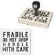 Große Briefmarke aus Gummi mit "zerbrechlich, nicht fallen lassen, vorsichtig handhaben" in bedrückter Serifentypografie. Erhältlich in verschiedenen Größen, mit zusätzlichen Tintenpatronen in vielen Farben.