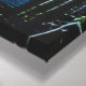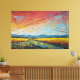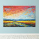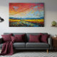 "Fragmentierter Horizont" stellt eine stilisierte Landschaft dar, in der goldene Felder und ein lebhafter Himmel mit überlagerten geometrischen Formen wie schwebenden Dreiecken und Vektorlinien verschmelzen. Die Komposition ruft ein Gefühl von Zeit und Raum hervor, das dekodiert wird, wobei der Himmel digitalen Schichten in Bewegung ähnelt. Ein zentraler blauer Bach durchquert die Szene und führt den Blick des Betrachters durch diese Mischung aus Realität und Abstraktion.