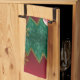 Fraktale bilden dieses stilisierte Weihnachtsdesign. Eine abgestufte rote Kulisse, ein würfeliger grüner Baum, goldene Sterne und Schneeflocken, die an einem Strang aus roten und goldenen Perlen hängen, und drei rote Kugeln mit einem wirbelnden goldenen Design, die vorne hängen.