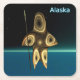 Ein braunes Fraktal-Bild, das auf einen hochstilisierten Inuit-Jäger hinweist, der traditionelle Pelzkleidung trägt und einen Harpunen mit Elfenbeinkopf trägt. Das Bild ist auf einem Hintergrund überlagert, der den dunklen polaren Winter darstellt. "Alaska" erscheint in blau-weiß.