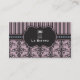 Un joli design damassé et rayé d'inspiration française présente un élégant arrière - plan lavande et un médaillon noir orné d'un couteau blanc, d'une cuillère et d'un logo de fourchette. Carte de visite idéal pour un restaurant, un chef, un traiteur ou toute autre entreprise de l'industrie de la restauration.