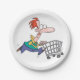 Ein hektischer Einkäufer, der mit einem Einkaufswagen herumschreit. Dieses Design wirkt auf diese Paper-Teller sehr effektiv