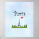 Ein Poster mit einem skurrilen zeichn des Eiffelturms, umgeben von grünen Bäumen und einem rosa, in der Luft schwebenden Wasserfarbenherz. Hellblauer digitaler Aquarellhintergrund.