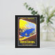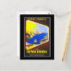 Klassische Vintage Reiseplakate, die mit den Zügen und Motorbussen der französischen Nationalbahn zur französischen Riviera fahren. Es zeigt durch ein Zugfenster einen Blick auf den Strand der Riviera.