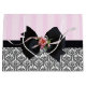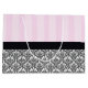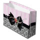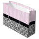 Große, glänzende Geschenktasche mit einem Bild von rosa-rosa Streifen auf der oberen Hälfte und ein schwarz-weiß traditionelles französisches Barock-Design in der unteren Hälfte geteilt durch ein schwarzes Band mit einem schwarzen Bogen mit rosa Rose und Band Details. Siehe dazu passende mittlere Geschenktasche. Sehen Sie sich die gesamte Geburtstagsgeschenktüte-Sammlung in den SONDERN-TOUCHS an. | Abschnitt Gastgeschenke.