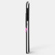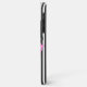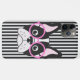 Ein Handy mit einem Cartoon Hund mit Brille, der Hund ist schwarz-weiß mit rosa Ohren und rosa Brille, der Hintergrund ist schwarz-weiß Streifen.