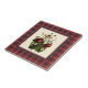 Keramik Fliesentrivet mit einer digital gereinigten Vintagen botanischen Abbildung von Erdbeeren auf einem leichten goldenen Pergament Textur Hintergrund. Gerahmt mit dem Fraser der Familie Lovat moderne clan tartan Muster. Traditionell Vintag schottisch kariert ab 1893 in hellrot, marineblau, waldgrün und weiß.