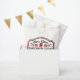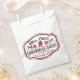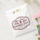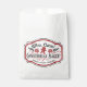 Diese Begehrensack im Bauernstil weist ein Logo-Design auf, in dem steht "Mrs. Claus' Gingerbread Bakery". Sie können mit einem Namen personalisieren. Die Farben sind rot und schwarz.