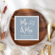 Elegante, kundenspezifische, staubige blaue Servietten für Ihren Hochzeitsempfang oder andere Hochzeitsfeiern mit "Mr. & Mrs." geschrieben in einem großen weißen Drehbuch und einer weißen Abbildung von zwei Herzen vereint. Geben Sie Ihren Namen und Ihr Hochzeitstermin ein.