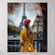 Aus der Sicht der Frau, die einen gelben Bademantel und einen roten Hut trägt, erscheint der Eiffelturm majestätisch und beeindruckend inspirierend. Das kompakte Gitterwerk und die hohe Höhe sorgen für Aufmerksamkeit, während das umliegende Stadtbild eine reizvolle Kulisse für die Sehenswürdigkeit bietet. Die Frau scheint voll in die Schönheit der Szene eingetaucht zu sein, und genießt einen Augenblick der friedlichen Betrachtung inmitten der geschäftigen Stadt. Mit einer Reihe von Größen- und Preisoptionen werden die Kunstwerke für jedermann zugänglich gemacht, wobei sie sorgfältig überprüft und angepasst werden, um höchste Qualität zu gewährleisten. Sie können als physisches Kunstwerk gekauft oder als digitale hochauflösende Datei heruntergeladen werden, um sich selbst zu drucken.