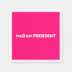 Frau Präsidentin, moderne typografische Papierservietten aus weißem und rosa Party. Weißer, fett formatierter Text auf heißen rosa bearbeitbaren Farbhintergrund. Man kann es personalisieren und einzigartig machen. Feiern Sie den Präsidenten der Nation am Tag der Amtseinführung des Präsidenten. Auch kann dies ein großartiges Geschenk zum Feiern einer weiblichen Chefin, die Präsident geworden ist. Präsident eines internationalen Unternehmens, eines Konzerns, eines kleinen Unternehmens, Chef, Präsident Ihrer Klasse, Studentenpräsident, etc.