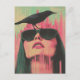 Eine Frau und ein schwarzer Vogel mit einem rosa Kristallturm im Hintergrund