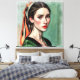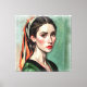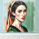 Diese aquarelle Inspiration zeigt ein künstlerisches Porträt einer Person mit romantischer Kunst. Man kann eine Frau mit einem farbigen Kopftuch (orange, weiß und schwarz) auf ihrem Kopf sehen. Sie trägt ein grünes Kleidungsstück mit schwarzen und roten Details. Sein Gesicht ist gekennzeichnet durch scharfe rote Lippen, Rosenwangen und einen scharfen Blick. Sie trägt auch einen Ohrring zu Schmuck. Der Hintergrund besteht hauptsächlich aus grünen Nuancen, die eine harmonische Atmosphäre mit den Klangtönen des Portrait schaffen. Künstlerischer Stil kombiniert klassische und zeitgenössische Elemente mit sichtbaren Pinselpillen und einer modernen Farbverarbeitung.
