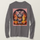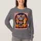 FrauenHalloween Gray Kitten T - Shirt Das ist ein Graufrauenkätzchen-T - Shirt. Das Design ist hübsch grau mit einem rosa und orangefarbenen Halloween-Hintergrund. Im Hintergrund gibt es Bäume und Kürbis. Das Halloween-Bild ist vorne und hinten im T - Shirt. Der T - Shirt hier ist ein grauer, langärmeliger T - Shirt.