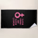 Das Strandtuch mit feministischer Botschaft ist mit einem rosa Frauensymbol und dem Text "Frauenrechte sind Menschenrechte" im Schriftart mit Pinselstrich auf schwarzem Hintergrund versehen.
