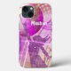Pinkfarbenes iPhone-Gehäuse mit gummiroter Volleyballgrafik in Rosa, lila und Gold und silberfarbener Vballspielerin, die im Netz springt - mit ihrem Namen anpassen - von katz_d_zynes ::: auch für andere iPhone-Modelle sowie iPad- und Samsung-Geräte erhältlich ... für andere Geräte, wählen Sie Ihren Gerätetyp Klicken Sie im Abschnitt "Stiloptionen" auf dieser Seite ... für Anpassungshilfe einfach auf den Link "Diesen Designer Gefragt" unten.