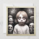 Creepy Halloween-Party Einladungen. Seltsames Kind mit großen beängstigenden Augen, umgeben von seltsamen Schädeln.