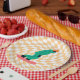 Freeride Snowboarder in grünem Anzug Checkered Pappteller