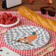 Freeride Snowboarder in Orange Anzug Checkered Pappteller