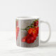 Herrliche, orange-rote Freesia Blume auf einem Holzboden. Dieses Foto wird dreimal um die Tasse wiederholt, um eine Augenätzung in jedem Winkel zu erhalten.