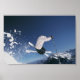 Dieses Bild zeigt einen phantastischen Blick auf einen Snowboarder, der den Hang gegen einen strahlend blauen Himmel stylt.